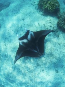 We dropped anchor near the town (about six nautical miles from the pass) and went via dinghy to go snorkeling in search of the mantas. No luck.