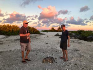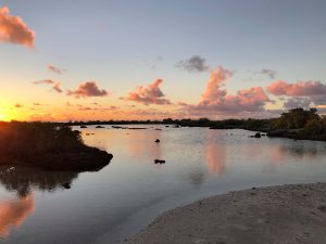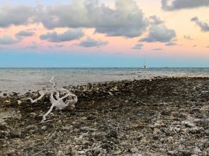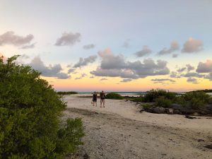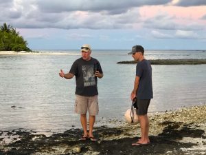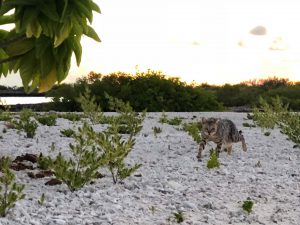 Pass anchorage: More gorgeous sunsets and a trip to the shore. While Nikki was making delicious pizza, Jason, CJ, Singa (the cat) and I went to shore for a walk and explore about. Jason found more floats washed ashore for Curiosity’scollection. There are many abandoned pearl farms so I suspect these floats came loose over time and ended up on shore. (Black pearl culture is the second largest industry in French Polynesia after tourism, however, the black pearl industry had a major crisis at the beginning of the 2000s – prices fell from 100 to below 5 US dollars per gram and many farms were abandoned. Overproduction and disorganized trade circuits are blamed.) Meanwhile ashore, Singa found some tasty grass, I found seashells, and CJ found conversation.
